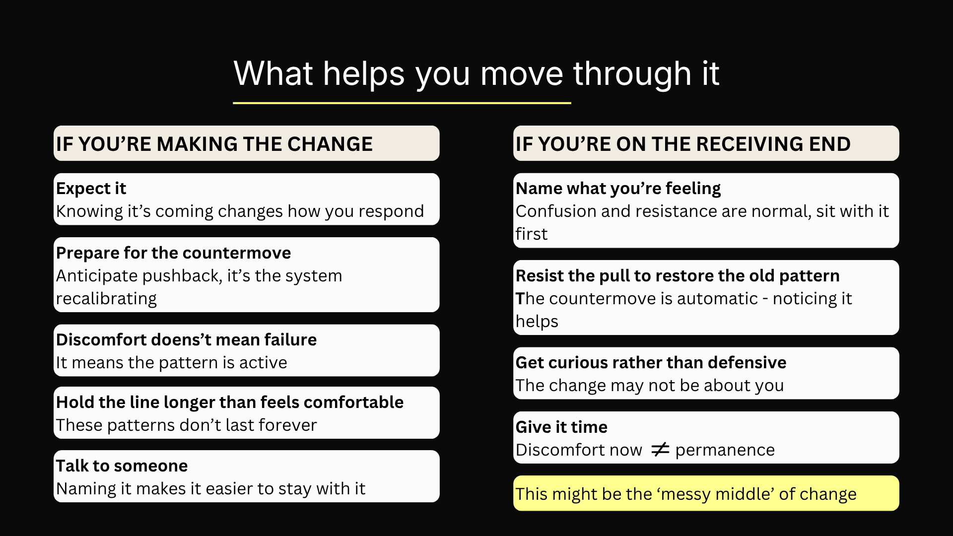 Colleagues push harder. A manager raises an eyebrow. People who've relied on the old pattern respond with confusion, frustration, or pressure: “But you've always done this. ” “We really need you.” This is the countermove, and it's almost always predictable once you know to look for it. It isn't personal. It isn't a verdict on whether the change is right. It's the system seeking its old balance.